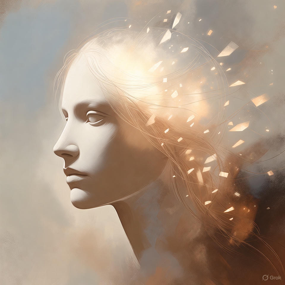 Conceptual, artistic illustration of memory loss caused by deficiency. Neutral human head silhouette in soft light, side view. From the back of the head, subtle glowing fragments drift away like fading memories.