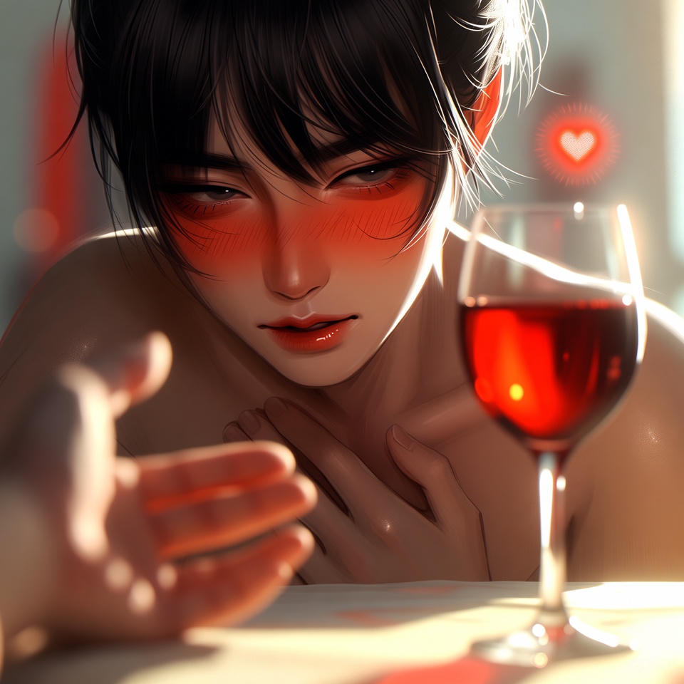 Frau schaut mit gerötetem Gesicht auf ein Weinglas. Künstlerische Darstellung einer Reaktion auf Histamin.